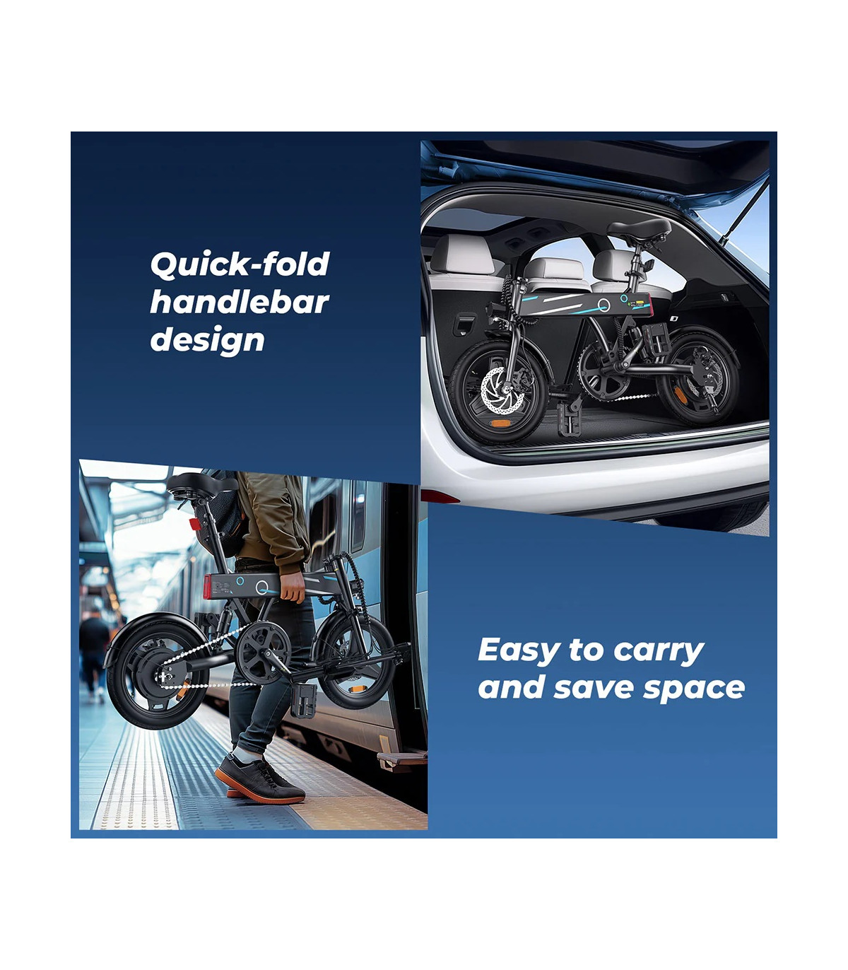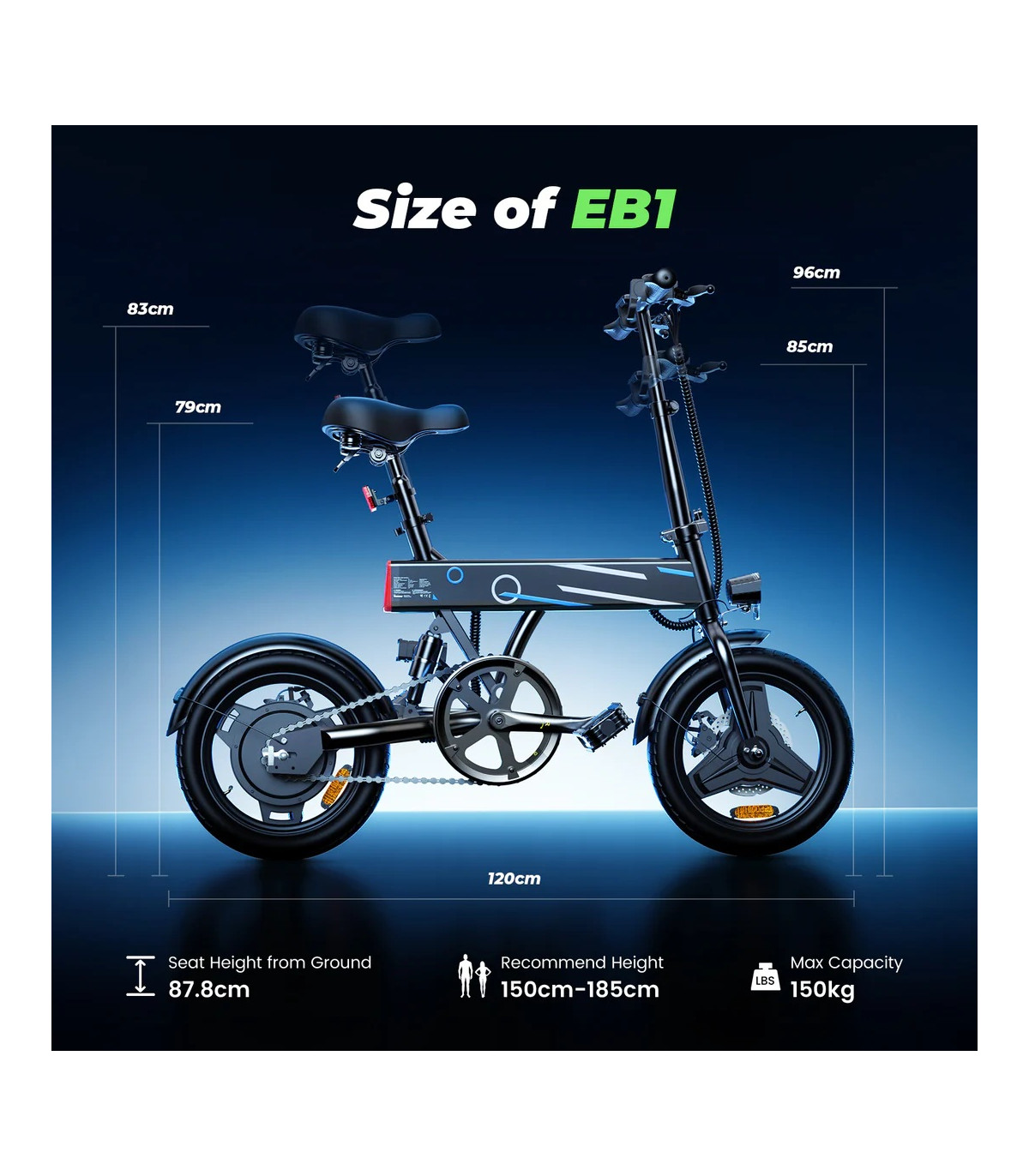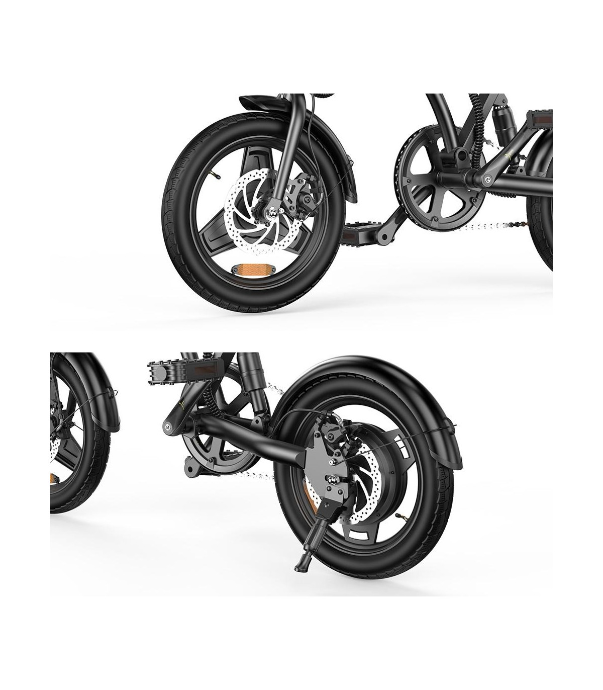 500W (пикова мощност) безчетков мотор 36V10Ah батерия, 5-6 часа зареждане 14' тънки гуми Максимална скорост 25 км/ч 60km с едно зареждаме (в pedal assist режим) Механични дискови спирачки Сгъваема рамка Тегло на...